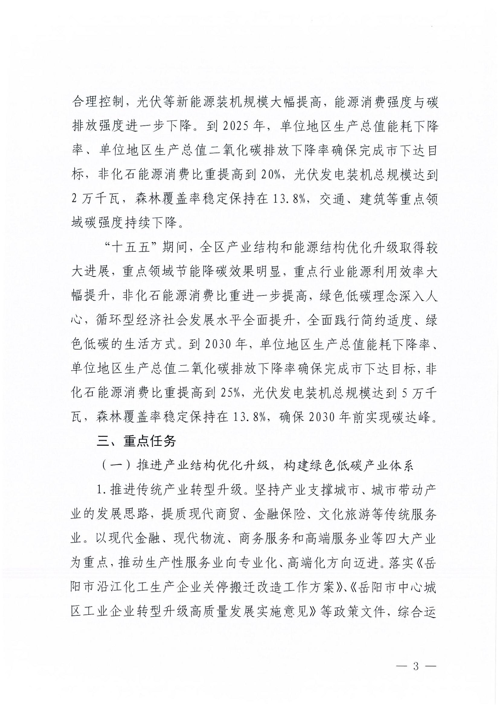 3月20日,湖南岳陽(yáng)市岳陽(yáng)樓區發(fā)展和改革局發(fā)布關(guān)于印發(fā)岳陽(yáng)市岳陽(yáng)樓區碳達峰實(shí)施方案的通知。通知指出,“十四五”期間,全區產(chǎn)業(yè)結構和能源結構明顯優(yōu)化,工業(yè)企業(yè)用能效率穩步提升,能源轉型成效初顯,煤炭消費總量得到合理控制,光伏等新能源裝機規模大幅提高,能源消費強度與碳排放強度進(jìn)一步下降。到2025年,單位地區生產(chǎn)總值能耗下降率、單位地區生產(chǎn)總值二氧化碳排放下降率確保完成市下達目標,非化石能源消費比重提高到20%,光伏發(fā)電裝機總規模達到2萬(wàn)千瓦,森林覆蓋率穩定保持在13.8%,交通、建筑等重點(diǎn)領(lǐng)域碳強度持續下降。