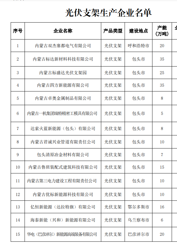 為落實(shí)自治區新能源裝備制造與新能源開(kāi)發(fā)一體化發(fā)展戰略部署,做大做強呼包鄂通光伏產(chǎn)業(yè)基地建設,進(jìn)一步推動(dòng)光伏裝備制造企業(yè)與新能源開(kāi)發(fā)企業(yè)開(kāi)展供需對接,內蒙古自治區工業(yè)和信息化廳將光伏裝備生產(chǎn)企業(yè)名單(第二批)予以公布。
