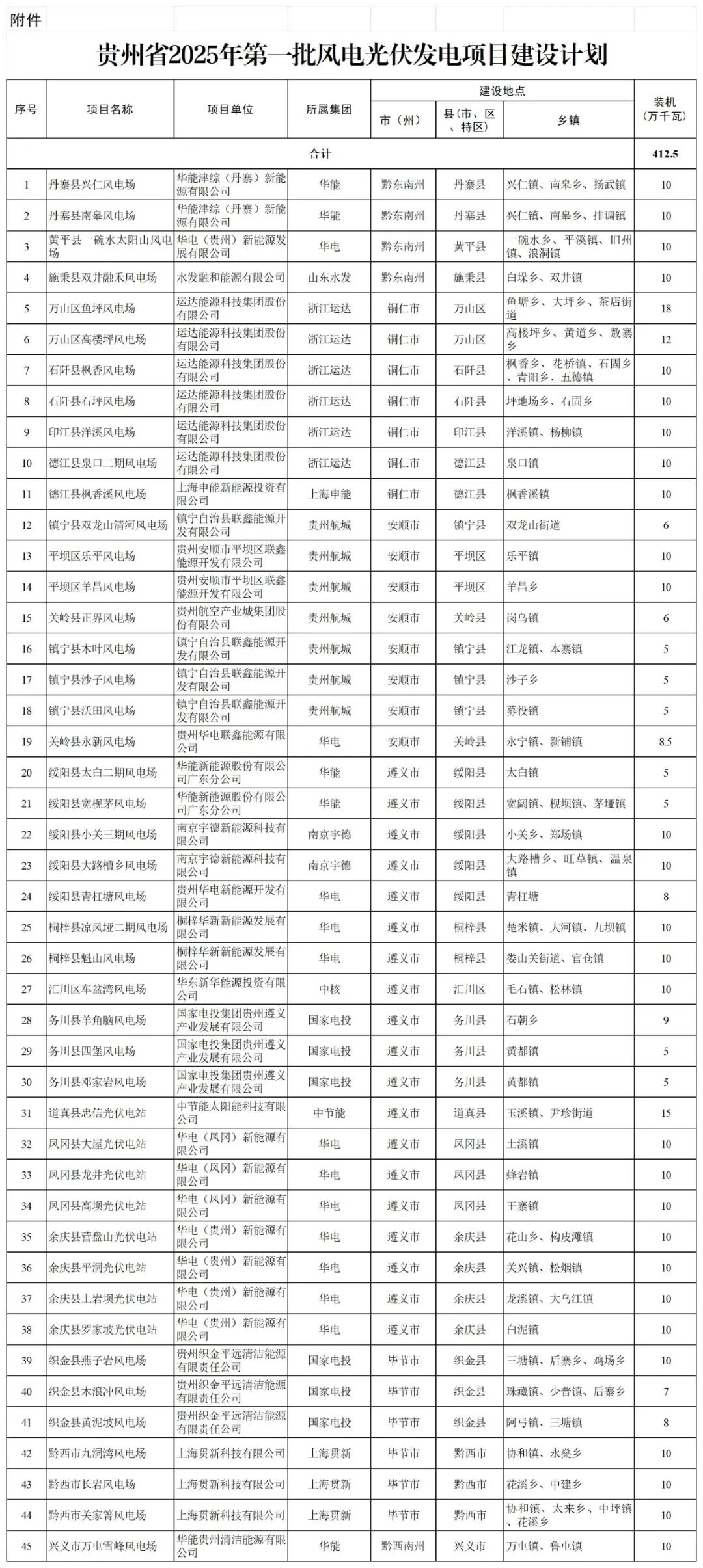 為貫徹落實(shí)國務(wù)院辦公廳轉發(fā)國家發(fā)展改革委、國家能源局《關(guān)于促進(jìn)新時(shí)代新能源高質(zhì)量發(fā)展的實(shí)施方案》(國辦函〔2022〕39號)等精神,根據我省新能源發(fā)展有關(guān)要求,我局結合實(shí)際制定了貴州省2025年第一批風(fēng)電光伏發(fā)電項目建設計劃,總裝機412.5萬(wàn)千瓦,現予以下達。