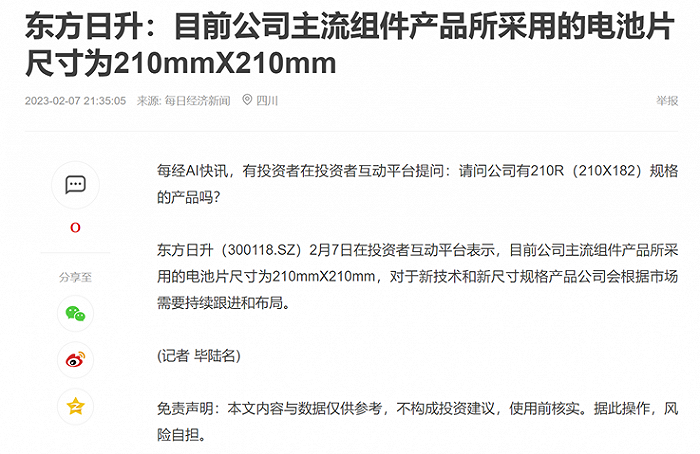 東方日升則在互動(dòng)易上稱(chēng),目前公司主流組件采用的尺寸為210mm*210mm。