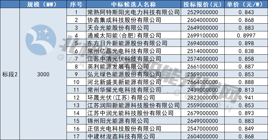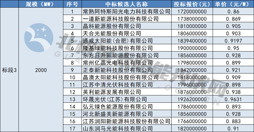 標段1為P型采購,投標單價(jià)為0.818~0.920元/W,投標均價(jià)0.859元/W;標段2為P型采購,投標單價(jià)為0.813-0.941元/W,投標均價(jià)0.872元/W;標段3為N型采購,投標單價(jià)為0.86-0.9631元/W,投標均價(jià)0.91元/W。