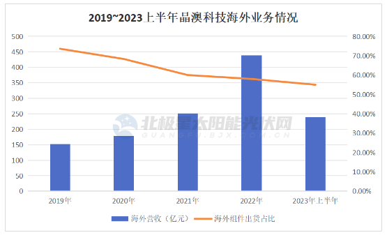 2019~2023年上半年,晶澳科技海外組件出貨占比過(guò)半,海外營(yíng)收連創(chuàng )新高,這不僅構成了其市場(chǎng)穩健的一大助力,也是高利潤的最強推手。