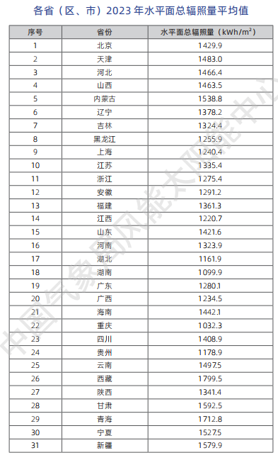 《公報》顯示,從水平面太陽(yáng)能資源來(lái)看,2023年,全國太陽(yáng)能資源總體為偏小年景,全國平均水平面總輻照量約為1496.1千瓦時(shí)/平方米,較近30年平均值偏小1.58%(23.6千瓦時(shí)/平方米),較近10年平均值偏小1.27%(19.0千瓦時(shí)/平方米)。較 2022 年偏小75.4千瓦時(shí)/平方米。