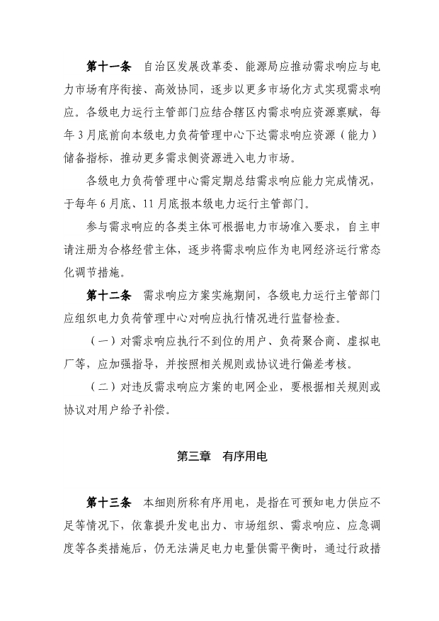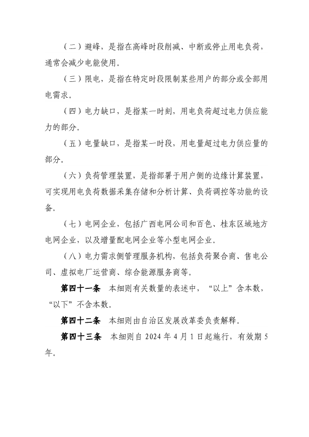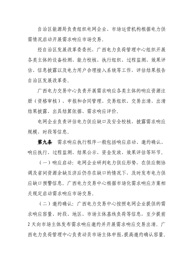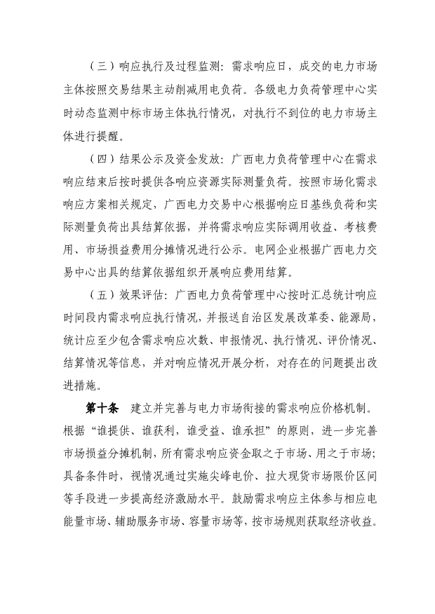 3月20日,廣西壯族自治區電力負荷管理實(shí)施細則印發(fā)。政策提出,建立并完善與電力市場(chǎng)銜接的需求響應價(jià)格機制。根據“誰(shuí)提供、誰(shuí)獲利,誰(shuí)受益、誰(shuí)承擔”的原則,進(jìn)一步完善市場(chǎng)損益分攤機制,所有需求響應資金取之于市場(chǎng)、用之于市場(chǎng);具備條件時(shí),視情況通過(guò)實(shí)施尖峰電價(jià)、拉大現貨市場(chǎng)限價(jià)區間等手段進(jìn)一步提高經(jīng)濟激勵水平。鼓勵需求響應主體參與相應電能量市場(chǎng)、輔助服務(wù)市場(chǎng)、容量市場(chǎng)等,按市場(chǎng)規則獲取經(jīng)濟收益。本細則自2024年4月1日起施行,有效期5年。