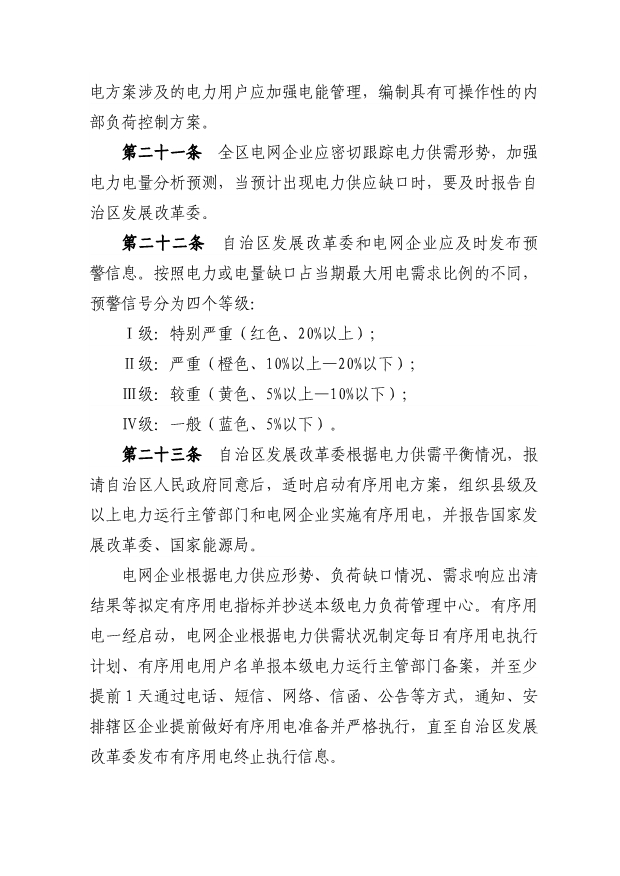 自治區發(fā)展改革委和電網(wǎng)企業(yè)應及時(shí)發(fā)布預警信息。按照電力或電量缺口占當期最大用電需求比例的不同,預警信號分為四個(gè)等級: