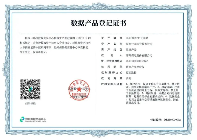 近日,鄭州煤電股份有限公司自主開(kāi)發(fā)的“煤炭行業(yè)綜合數據智庫”“煤炭行業(yè)供應商核心數據集”兩款數據產(chǎn)品通過(guò)公示,獲得“數據產(chǎn)品登記證書(shū)”,正式在鄭州數據交易中心登記掛牌,此為河南省煤炭行業(yè)首批數據產(chǎn)品登記憑證。